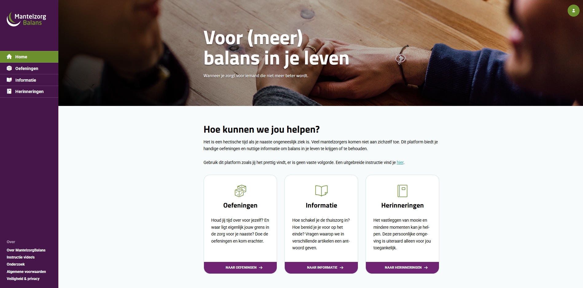 Het digitale platform MantelzorgBalans bedoeld voor mantelzorgers die zorgen voor een ongeneeslijk zieke naaste, biedt praktische informatie, tips en oefeningen om in balans te komen en te blijven. Ook kan men zijn of haar ervaringen hier opschrijven. MantelzorgBalans is gemaakt met mantelzorgers en experts en hiervoor is samengewerkt met verschillende partijen (waaronder Zorgbelang Groningen). Op dit moment wordt onderzocht welke professionals (bijvoorbeeld huisartsen, thuiszorgmedewerkers) mantelzorgers op MantelzorgBalans kunnen wijzen en hoe zij mantelzorgers hiermee het beste kunnen begeleiden. Zorgbelang Groningen denkt bij dit hele project mee.